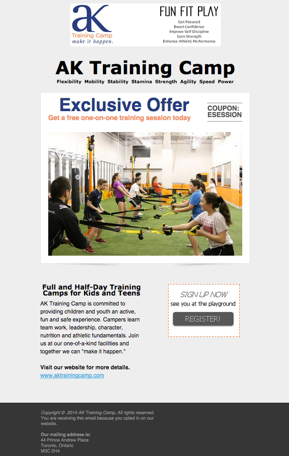 During Seneca College’s Web Optimization Analyst program, I created an email marketing blast for local GTA business AK Training Camp, with the goal to encourage camp sign ups by offering a free one-on-one training session.