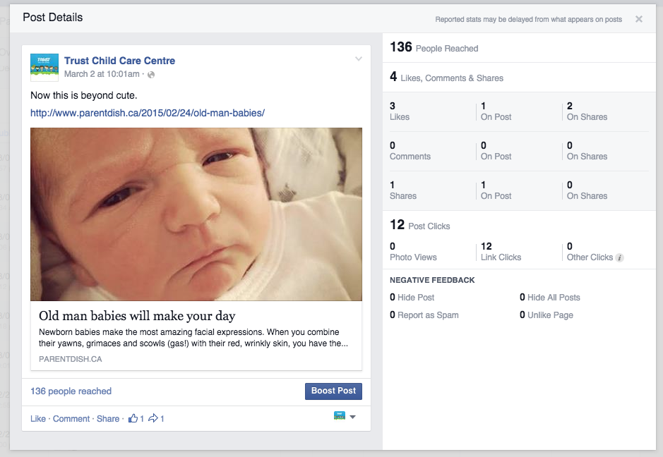 Trust Child Care Centre is a family-owned and operated daycare centre located in central Toronto. On a daily basis, I update their Facebook page with interesting and relevant content. With no budget to boost posts or create ads, all posts are organic and aimed at engaging the Trust Child Care community with content that is interesting. The Facebook page is a hub of information, and posts range from memes, to videos and articles.